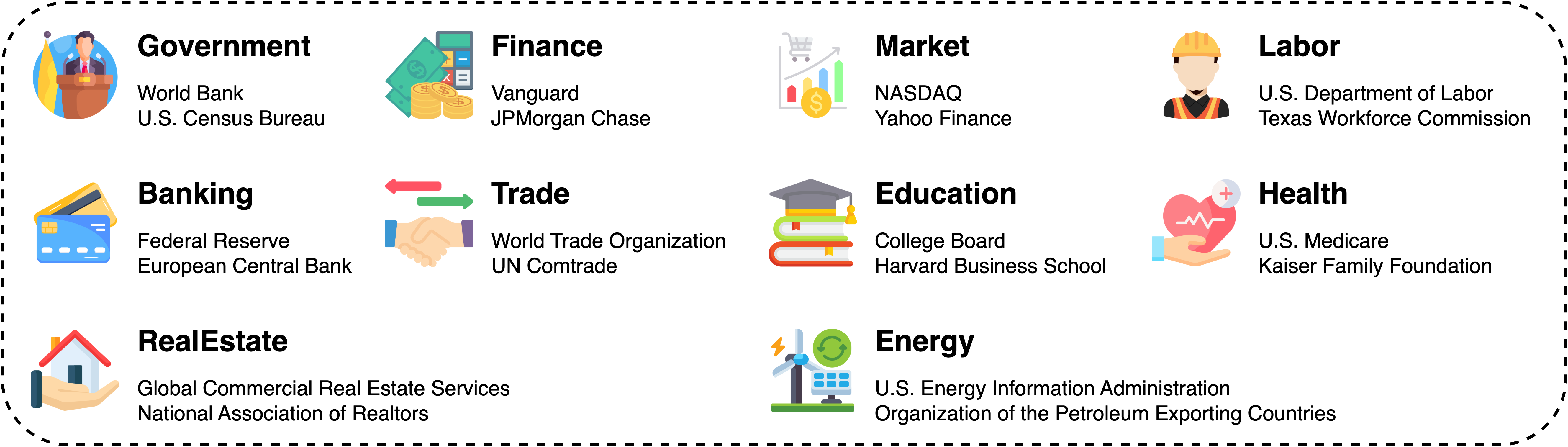 The EconWebArena benchmark covers a wide range of economic domains and task types. Each task is grounded in a real website and designed to test agents' abilities in navigation, retrieval, and reasoning.
